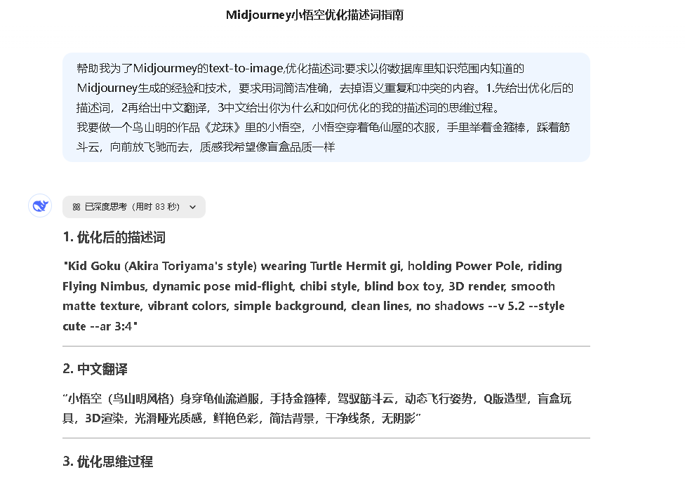 关键优势: DeepSeek 生成的描述词远比普通人自己想的更专业、更有效,这是直接用 AI 绘图工具难以达到的效果。它帮你把模糊的需求,翻译成了 AI 能懂的“行话”。