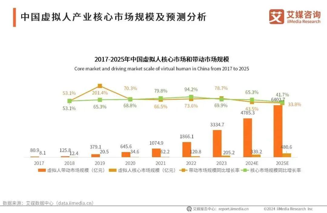 据《2024年中国虚拟数字人产业发展白皮书》预测,到2025年,我国虚拟人带动的产业市场规模有望达到6402.7亿元,核心市场规模也将增长至480.6亿元,有着很大的发展空间。