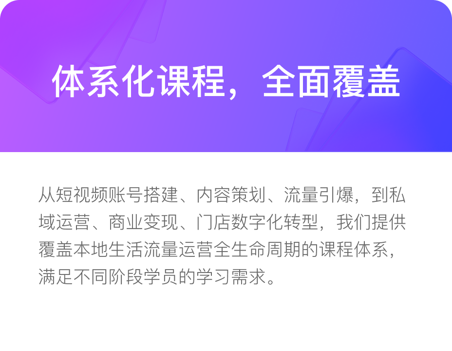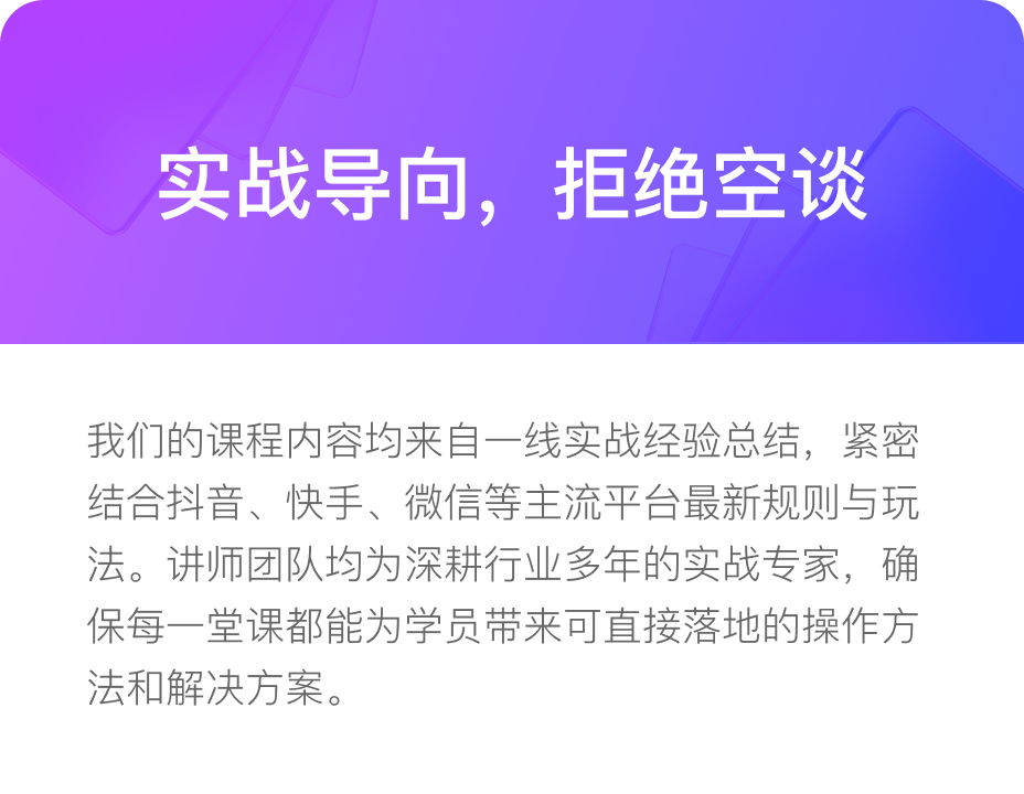 我们坚信,“授人以鱼不如授人以渔”,通过“理论+实操+案例”的沉浸式教学模式,帮助学员快速掌握流量运营核心技能,打通“线上引流-线下转化-私域复购”的全链路增长路径。