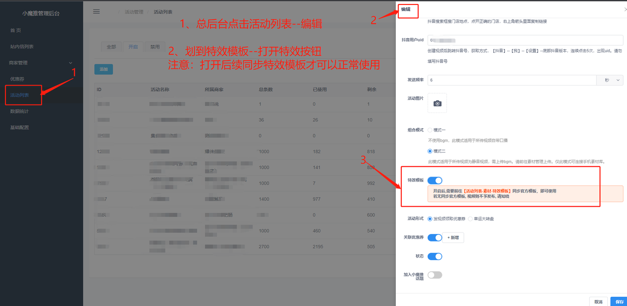 3.1 视频素材开启特效,操作流程:点击活动列表----编辑----开启特效----素材----特效模板----一键同步(注意此时素材必须为5个场景哦)否则特效同步失败