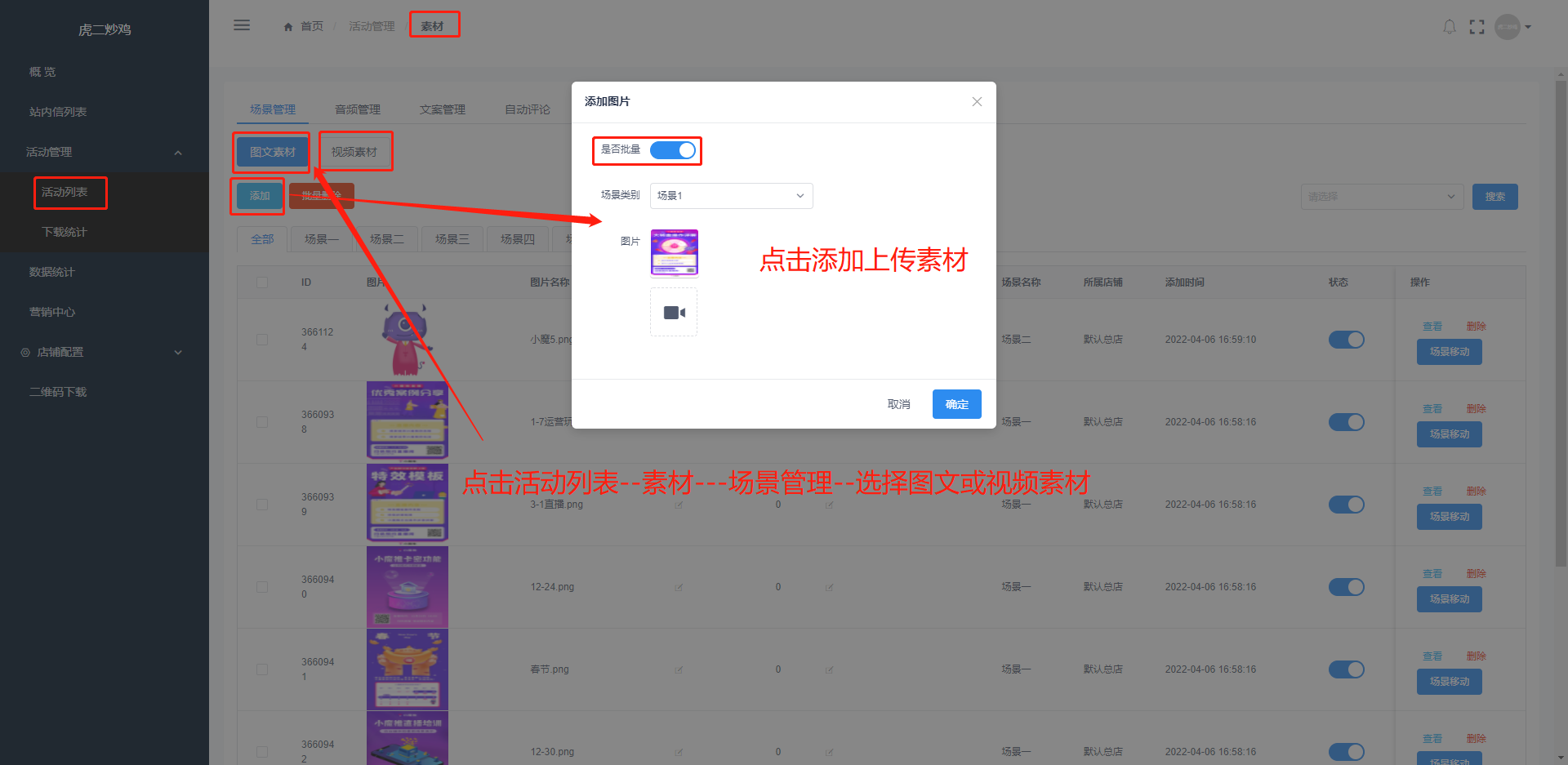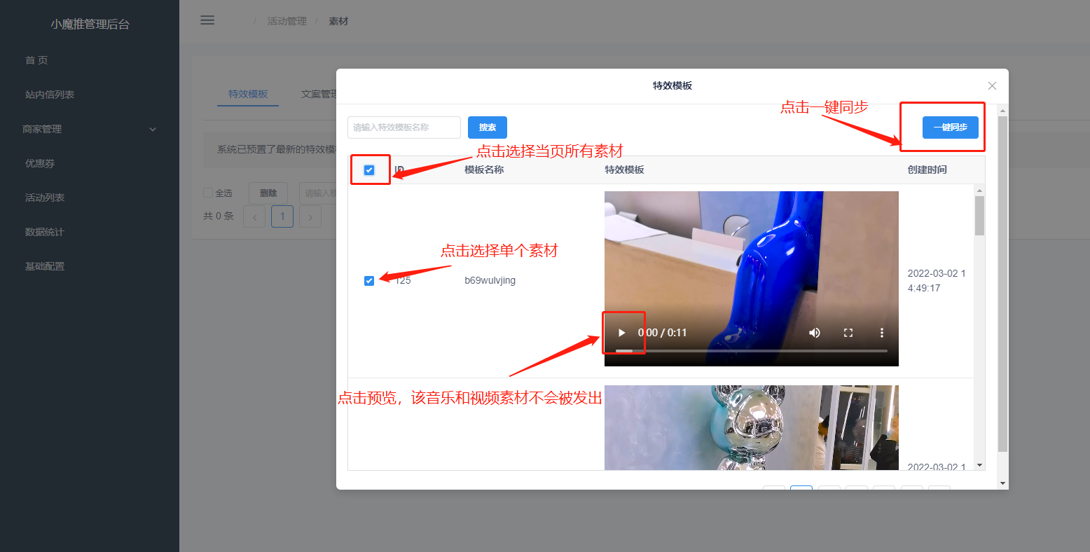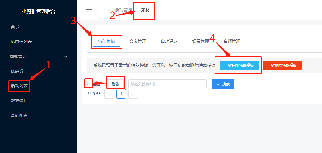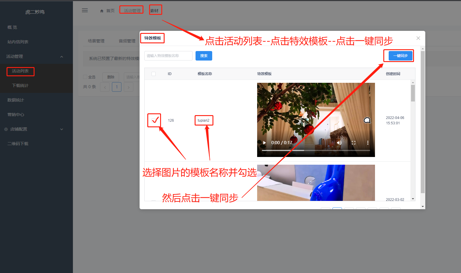 点击活动列表----编辑----开启特效----素材----特效模板----一键同步(注意此时素材必须为5个场景哦)否则特效同步失败