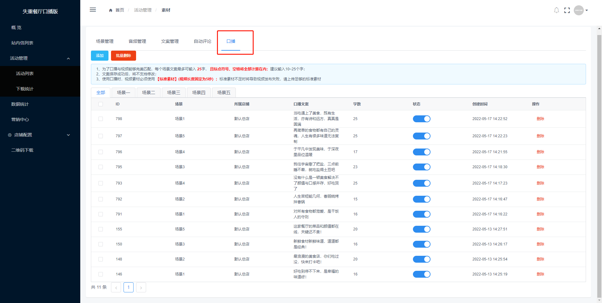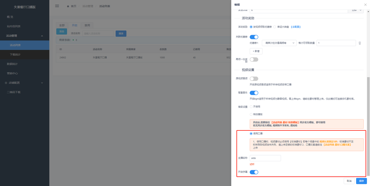 · 口播功能开启后,5个场景均要有标准素材,否则无法发布视频