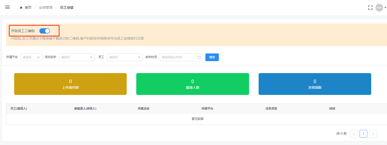 · 商户管理员可以看到员工的邀请人数和发布视频数量。开启后,员工可通过小程序端下载自己的二维码,客户扫码发布视频会作为员工业绩进行记录