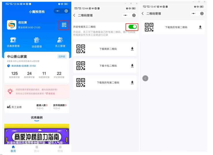 商家开启员工业绩考核:· 管理员进入小魔推小程序——点击二维码图标——开启专属员工二维码功能。