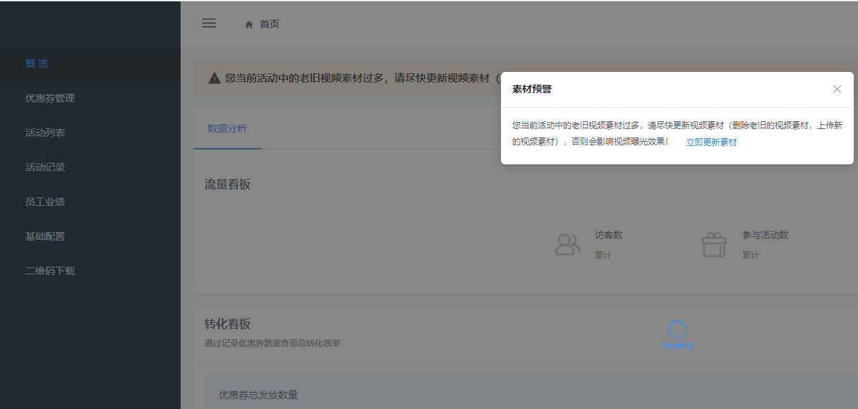 素材老旧程度高时,商家后台的登录页面就会显示并弹出。点击---“立即更新素材”就会跳转到视频素材库,可以批量筛选删除老旧视频素材