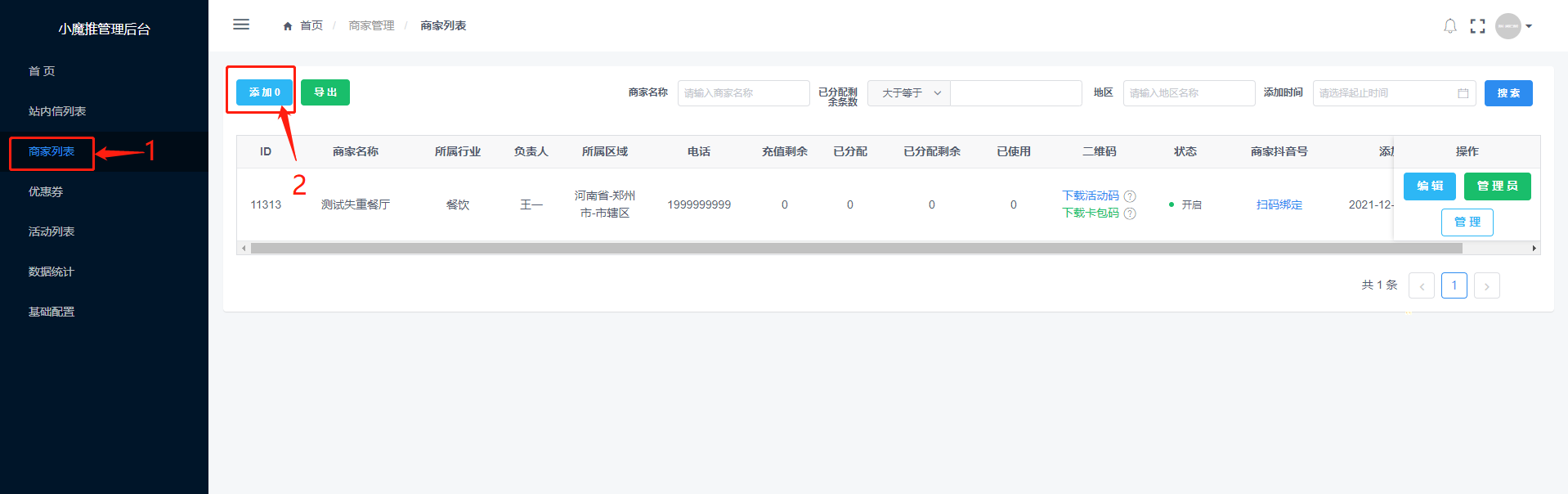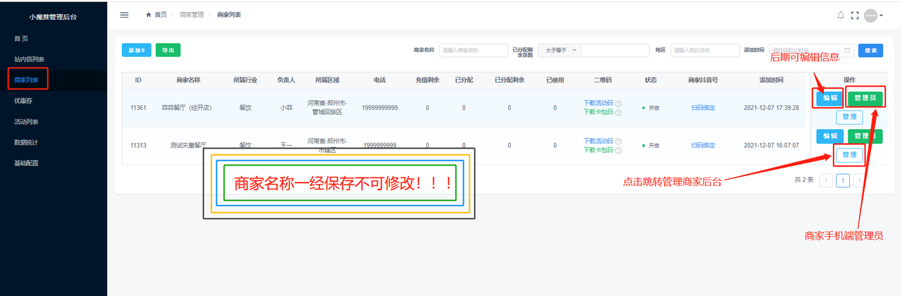 · 管理:点击后可跳转并管理商家后台(推荐用谷歌浏览器!!!)