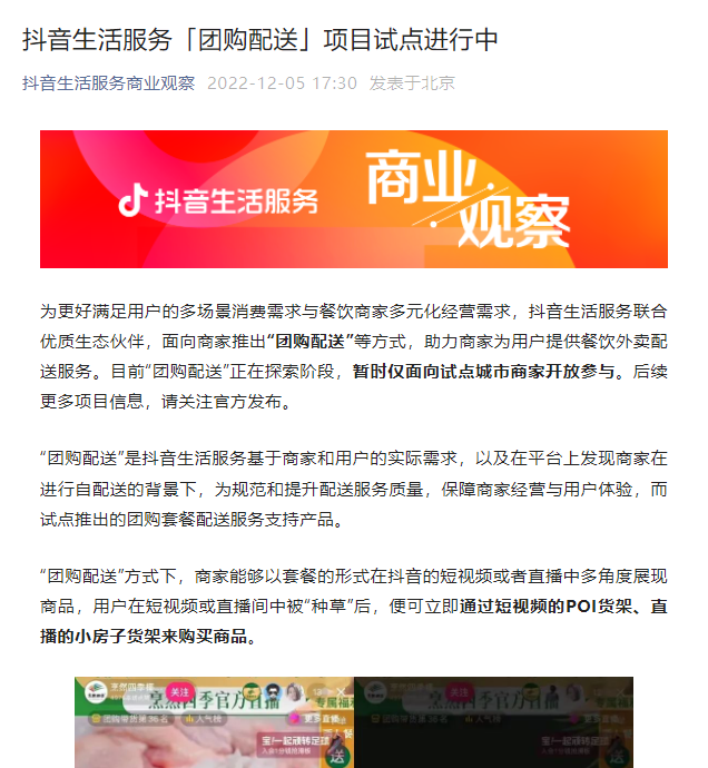 2022年12月5日,“抖音生活服务商业观察”发文称,为更好满足用户的多场景消费需求与餐饮商家多元化经营需求,抖音生活服务联合优质生态伙伴,面向商家推出“