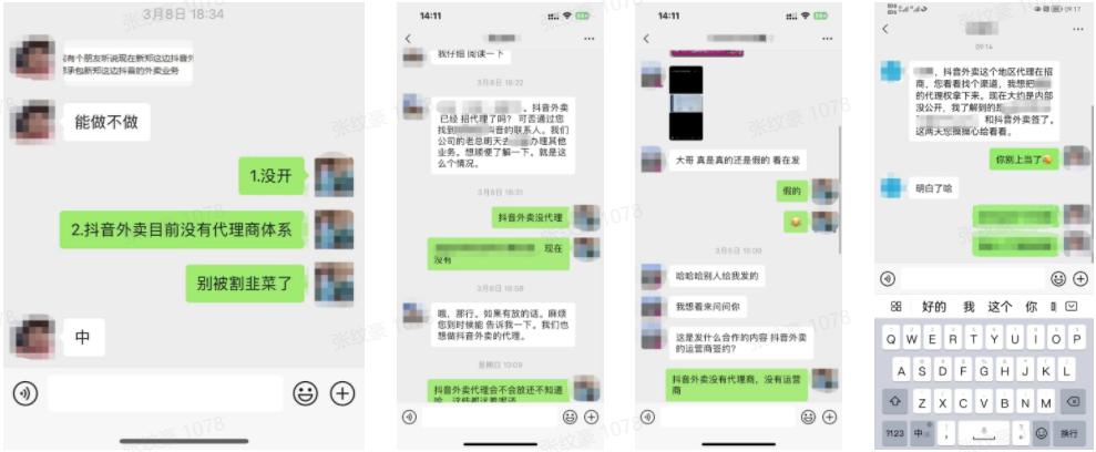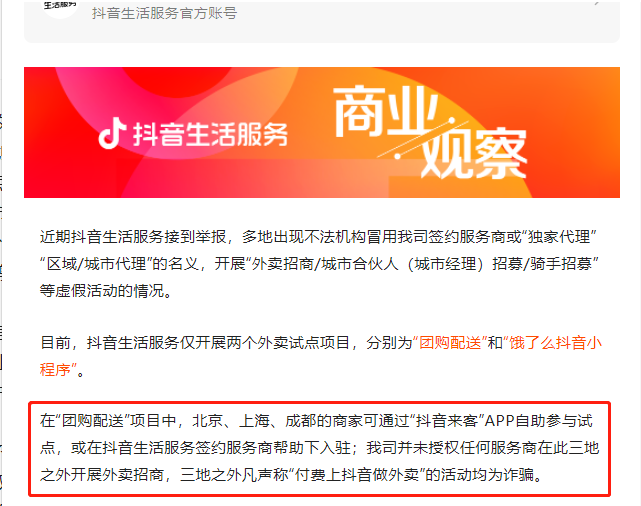 抖音团购配送业务仍在北京、上海、成都三个城市试点中,没有任何服务商有权限在此三地之外开展外卖招商,三地之外凡声称“付费上