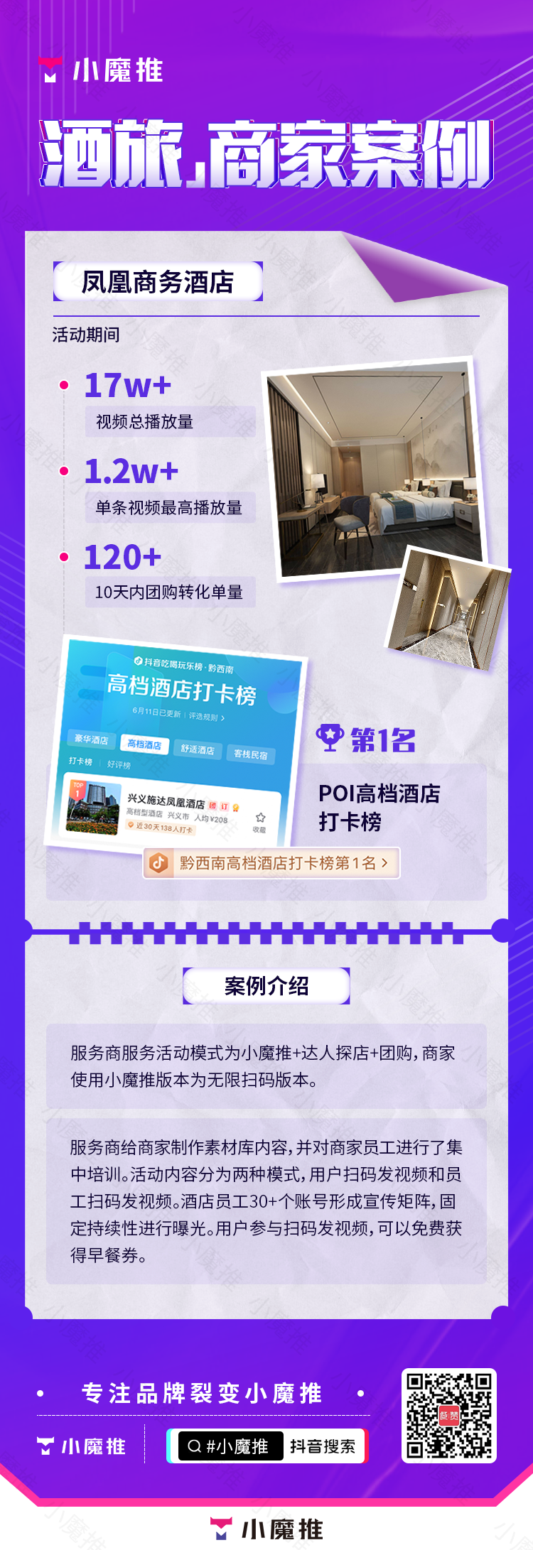 小魔推对酒旅类商家的服务塑造也拿出了好成绩,帮助商家登上了当地高档酒店打卡榜的第一名。