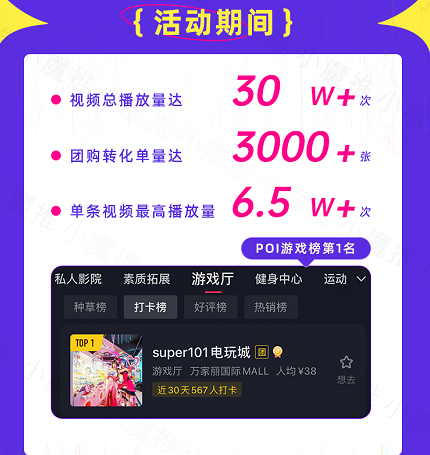许多实体商家使用小魔推同城拓客系统后。活动期间曝光量达到了三十万,单条视频最高播放量达6.5万次,通过用户扫码发布的视频挂载的团购套餐进行购买就有3000单,并且成为本地吃喝玩乐榜单第一。让商家以超低成本达到了高曝光的目的!