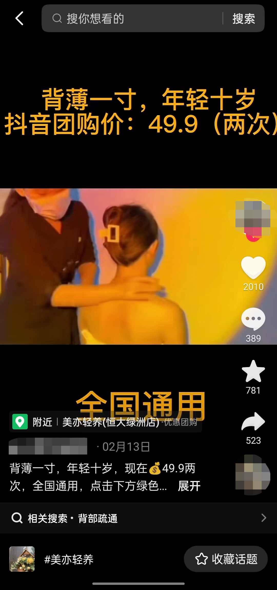 美亦轻养视频上方的文字就是常驻文字,直接介绍了团购的价格和性价比内容,还强调了全国通用的重点,随着视频播放,会一直停留在画面中,助力团购转化。
