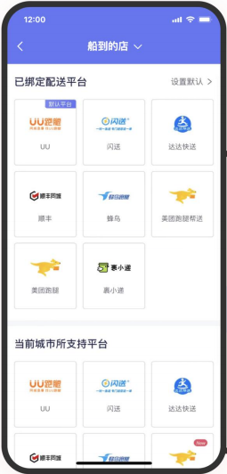 船到授权绑定多个运力平台账号,包括UU跑腿、蜂鸟、闪送、达达、顺丰等,支持商家自配送,用一个后台可进行配送运力资源的智能调度管理。
