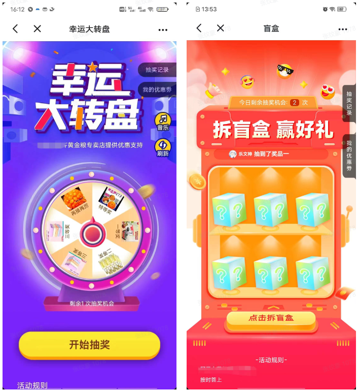 小魔推的大转盘或者拆盲盒功能,设置兴趣性活动,进一步提升客户的参与度。奖品可自行设置,酒品、毛巾、洗衣粉、农业种子等都可以。再加上客户要想参与大转盘抽奖或者拆盲盒活动,皆需要先扫码发视频,这样一来,也大大提升了门店曝光度!
