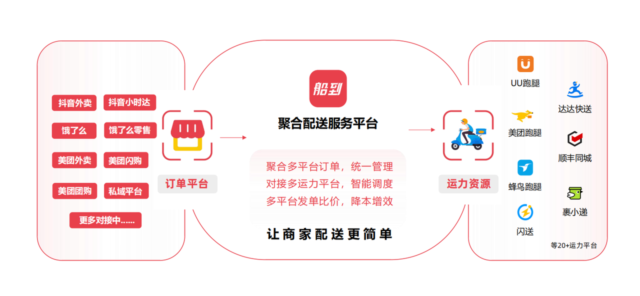 聚合配送服务平台,也是抖音外卖SaaS技术服务商,如今也已取得抖音小时达即时零售配送服务商资质,所以想要入局即时零售的,都可以选择船到,目前已经对接了抖音小时达、美团团购、饿了么零售私域平台等大部分零售平台,同时提供UU跑腿、达达快送、顺丰同城、蜂鸟快送等数二十家运力资源!