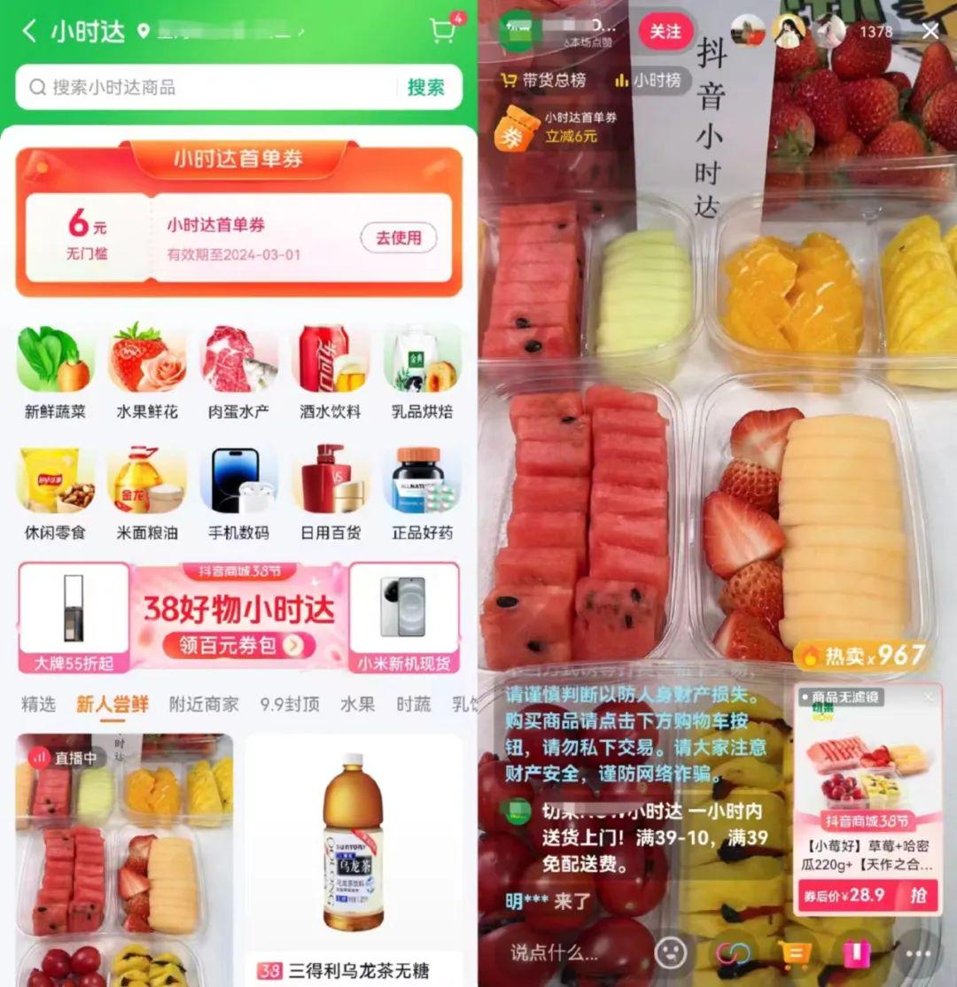 区别于其他几个即时零售平台,抖音小时达是具有天然流量池的,视频/直播与零售百货结合,刷到就买,买到就送。