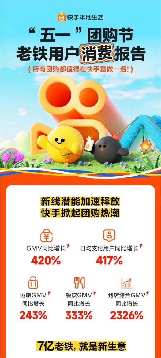 首先,在快手,7亿老铁用户带来“乘数效应”,成为当前团购消费的最大“增量需求池”。数据显示,2023年Q4快手本地生活GMV同比增长25倍,买家数增长23倍,新线城市用户规模增长545%。快手平台有下单行为的老铁用户人均月购物金额超1000元,活跃日活用户日均使用时长超2小时。