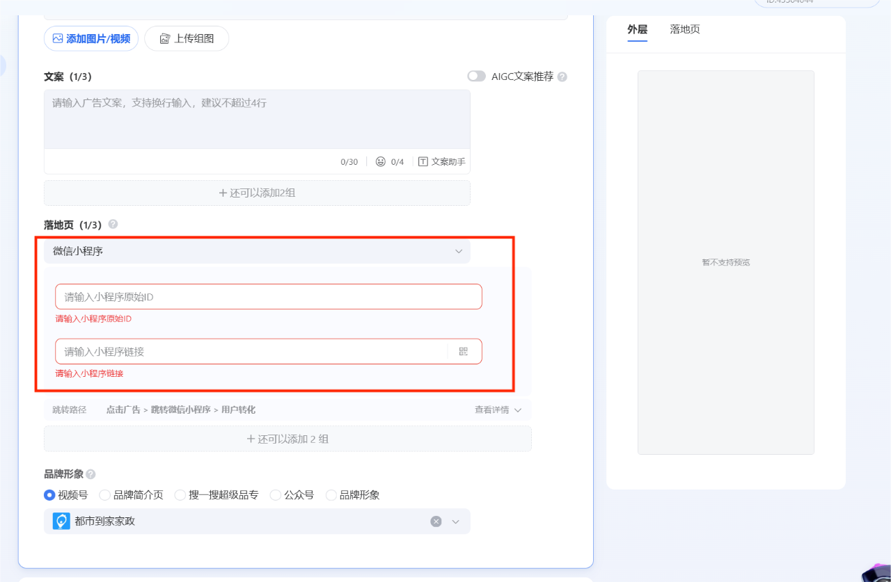 餐赞优选视频号后台,商家在发布视频时就可以实现挂载。在做推广时可选择挂载已匹配的小程序(输入小程序ID),以及小程序内想要推广的产品(产品详情页的链接)。