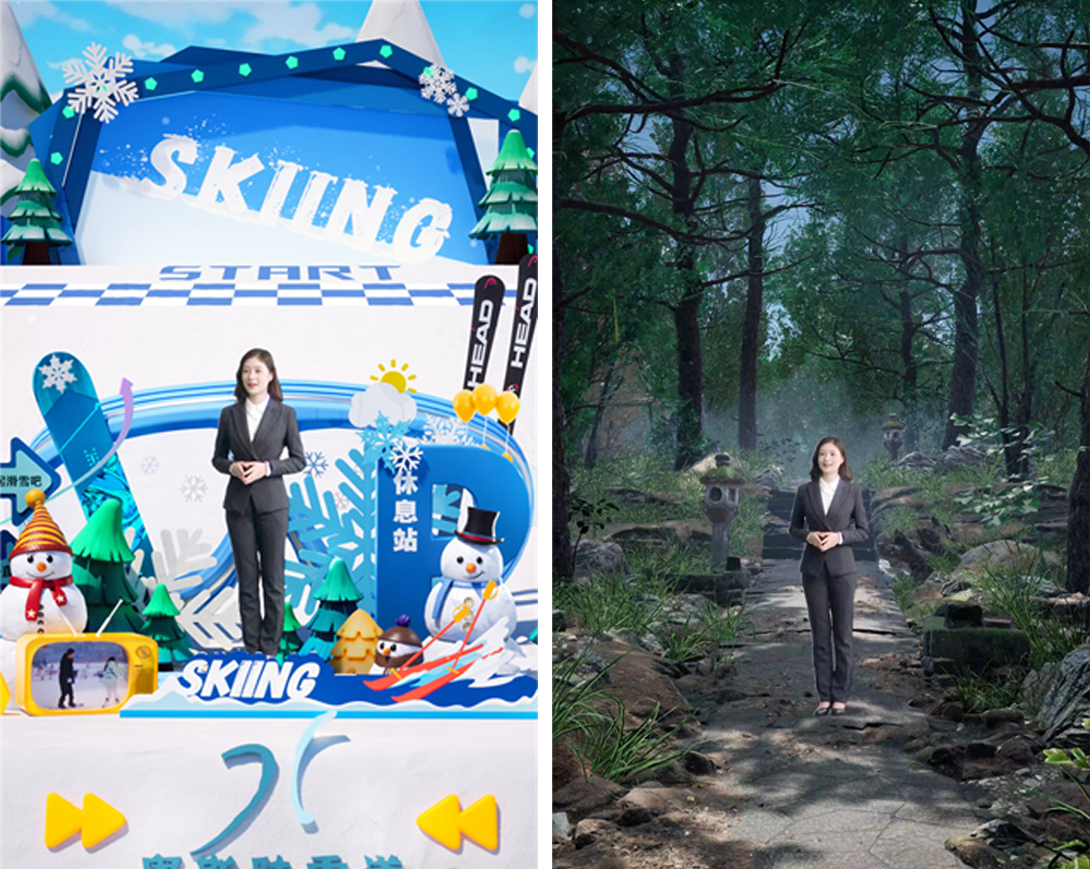 而现在通过XR就节省了场景搭建的成本和时间,构建一个雪山、森林场景,直接把雪山、森林搬进直播间,也不用亲自跑到雪山、森林去。一个模板成本解决后续所有场直播的场景搭建成本、时间成本、旅途成本、多门店开播成本等等。