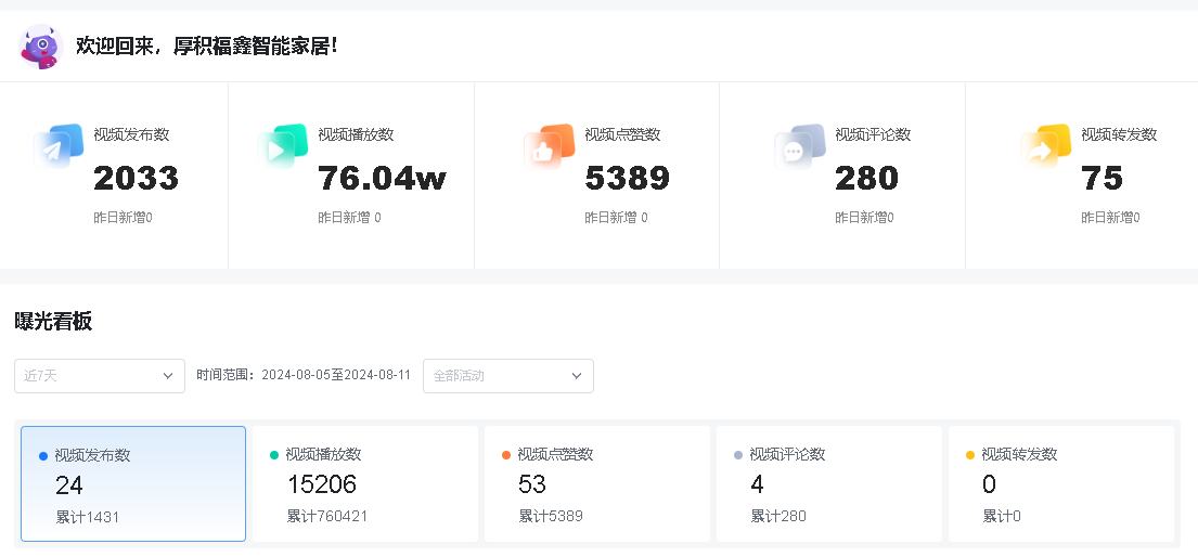 视频效果:凭借小魔推矩阵营销覆盖面积广、触达人群多、曝光几率大的特点,这个家居商家短时间内就发布了2033条视频,实现了76w+的视频播放量!
