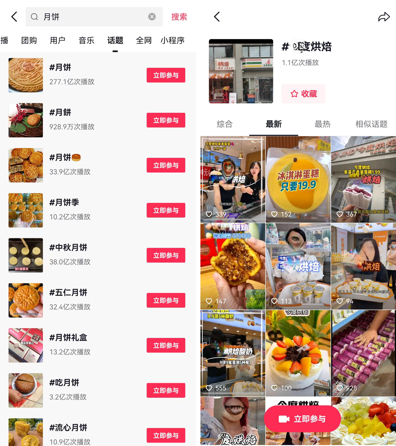 04 建立专属话题在发布视频时可以挂载热门话题,比如#月饼、#五仁月饼,为视频获得话题热度,因为发布了大量的内容,就可以增加在话题内的视频占比,更容易被用户刷到看到。也可以搭建自己的话题,比如品牌名、产品名。