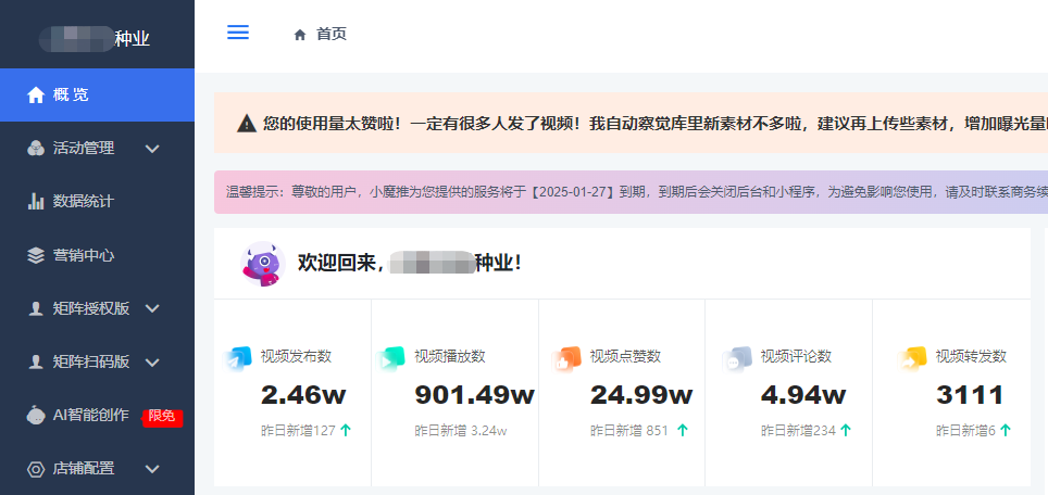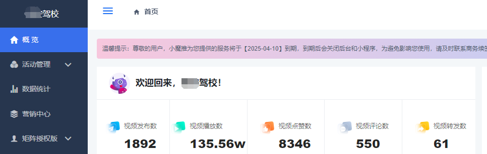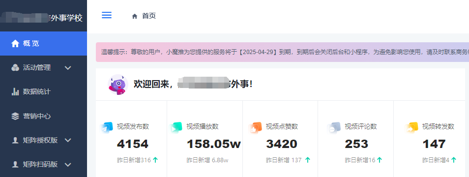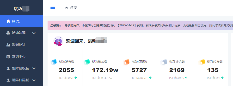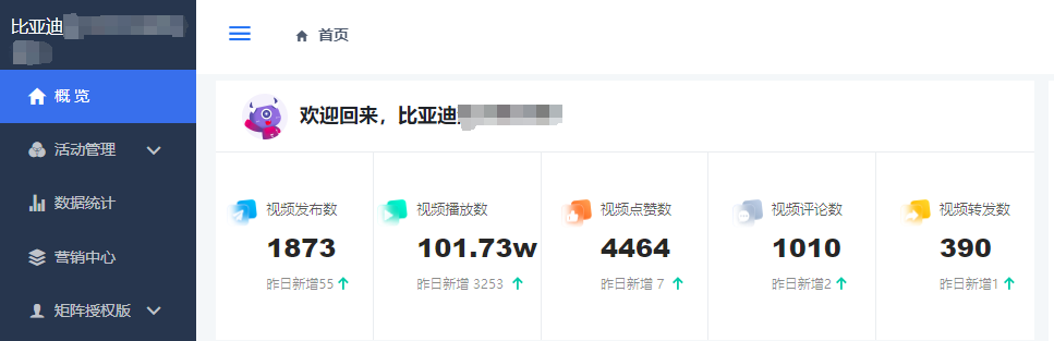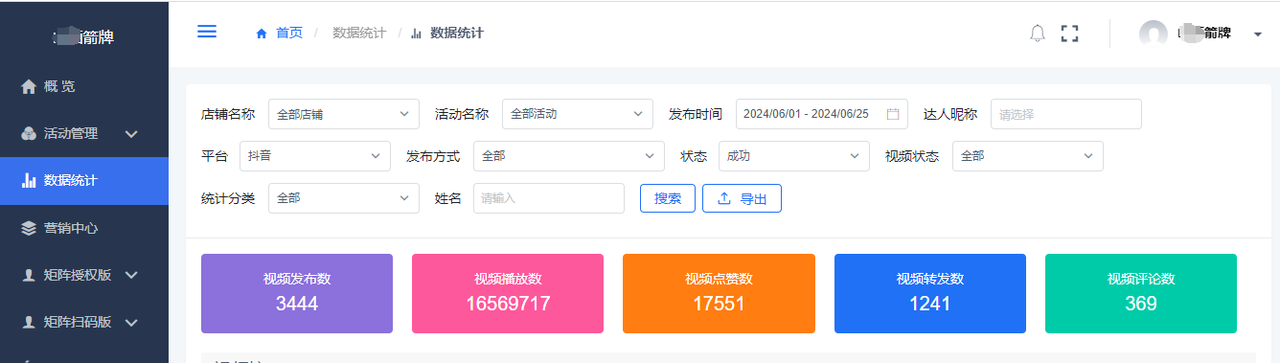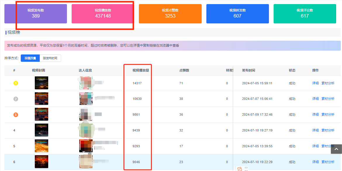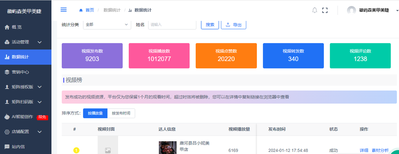 04、数据查看后台可看到矩阵账号下总共发布的视频数、视频播放量、转发量、评论等等
