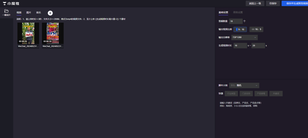 02、视频创作上传素材(图片/视频),小魔推“一键成片”批量剪辑生成成片