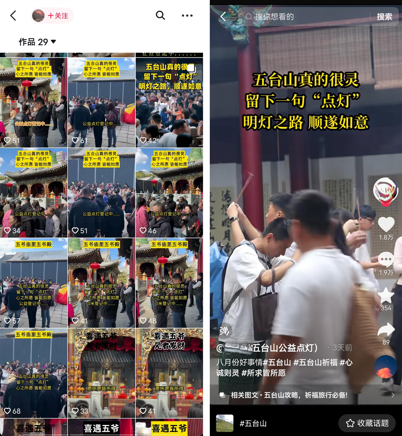 比如:本次小魔推案例中的五台山宣传的视频内容,内容重点就是「 五台山真的很灵,留下一句“点灯” 明灯之路 顺遂如意 」。