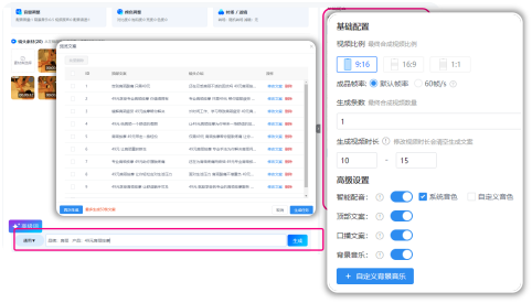 模式一 AI一键成片:将素材批量上传至后台,只需要输入生成条数和时长,就可以一键生成批量视频。根据关键词AI智能接口就能批量形成不重复的视频文案和标题。