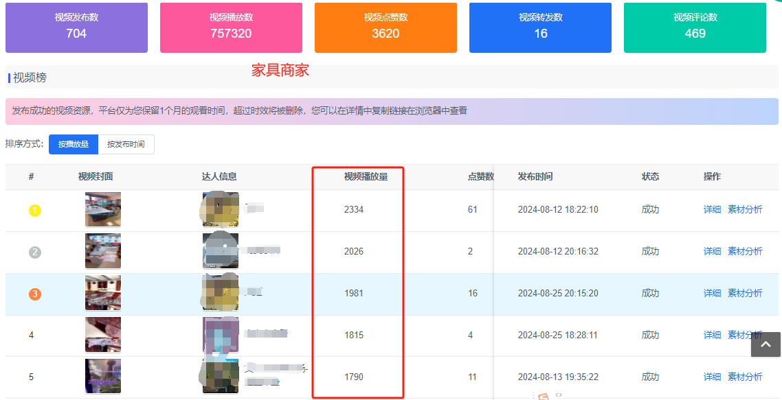 视频效果:服务商一共帮商家发布了700条视频,短时间内就获得了大量的曝光,归根到底是遵循了一个道理:视频越多,曝光的几率就越大,获客量也随之提升,这就是矩阵营销的意义!