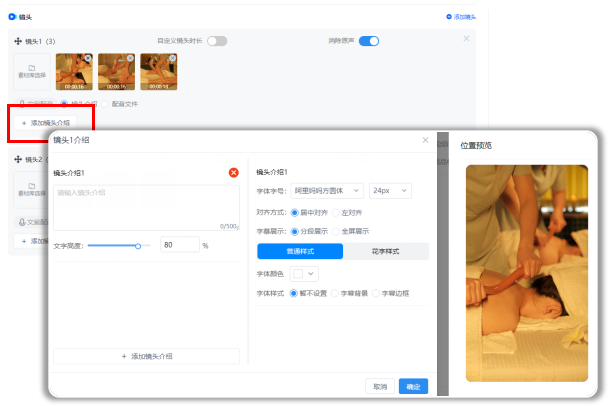视频设置:转场、滤镜、文案 音频管理、常驻文字,自动评论、一键选择