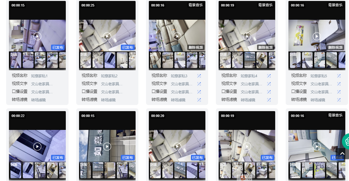 • 素材的拍摄:主要为家具展示、场景展示、试用展示、门头展示以及门店人气展示等,这些素材全都是用手机拍摄,随手可拍,画质良好,关键在于数量多、镜头多,非常有利于后续的混剪成片。