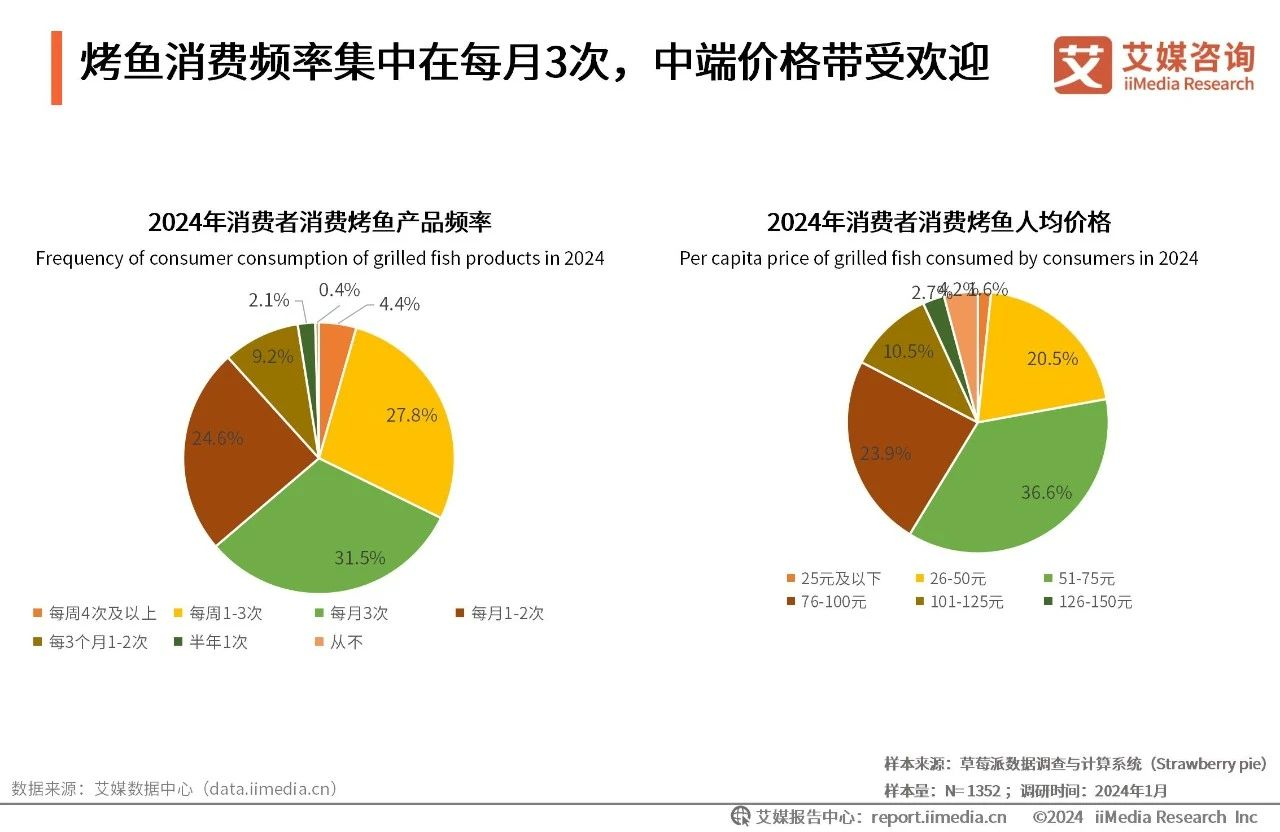 而之所以定这个价格,除了在保证门店的成本和利润之外,更是基于中国人对烤鱼商品的价格接受度进行的综合考虑。据艾媒咨询数据显示,消费者每月消费烤鱼产品的频率集中在3次,消费烤鱼人均单价主要在51-100元。因此商家从中等价格线入手,提高烤鱼的性价比,可以让消费者获得更好的消费体验。
