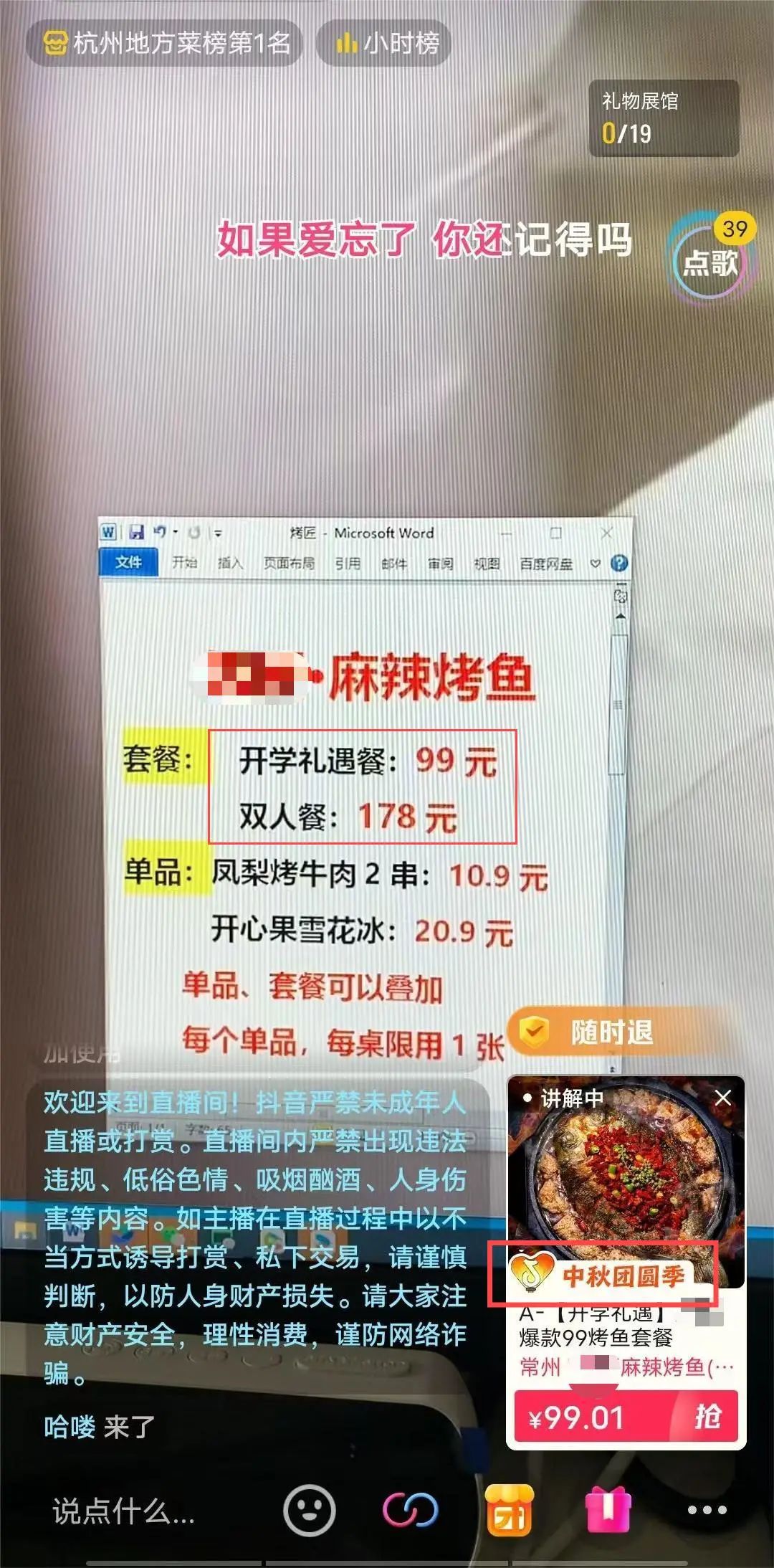 商家选择在这个阶段进行直播推广,而这个时间段正好是开学季和中秋节日,因此商家就主打这两个消费场景,重点推“开学礼遇餐 99元 ”、“中秋团圆季”的168元双人餐、289元四人餐。开学餐靠低价吸引学生,中秋餐靠品质和人群需求吸引要过中秋节日的用户。