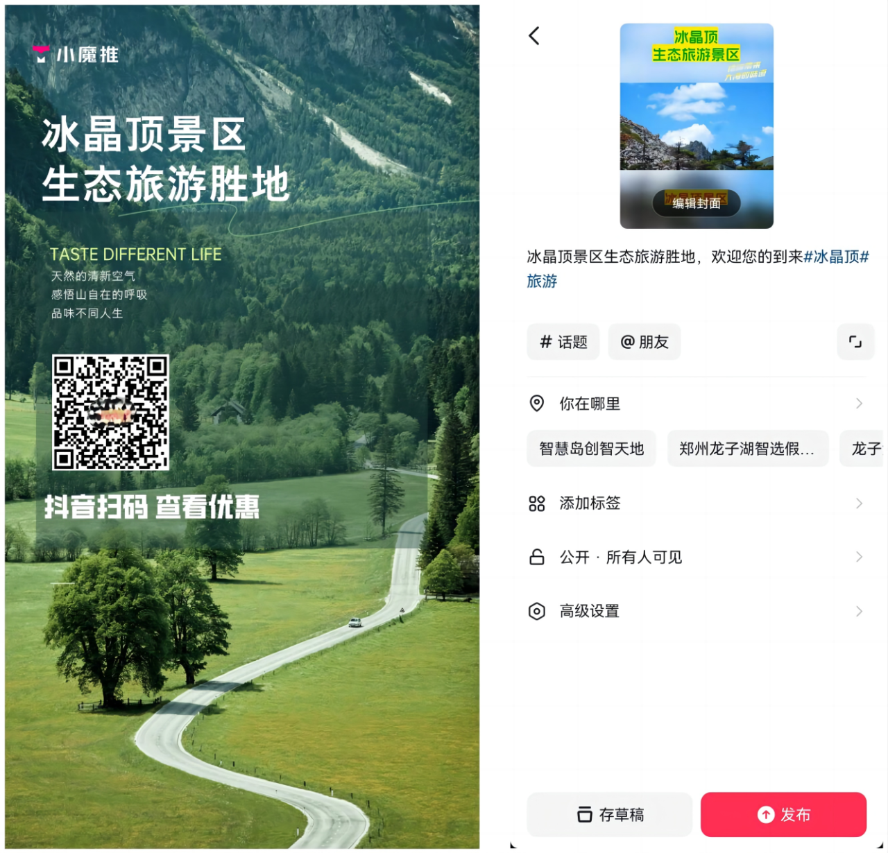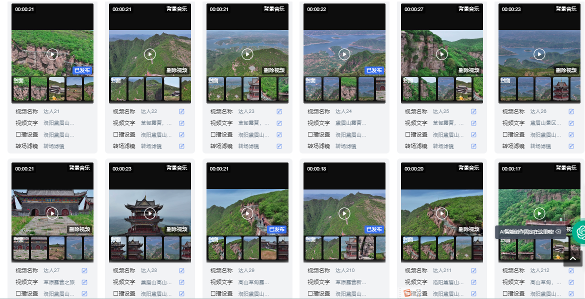 1智能化的视频逻辑合成技术能力它可以快速将景区提供的图片、视频素材以及文字描述等内容,自动合成为高质量、富有创意的短视频。无论是黛眉山的壮丽山峰、绚丽的花海,还是古老的寺庙、神秘的传说,都能在小魔推的妙手下转化为引人入胜的视觉盛宴。这不仅大大节省了景区的制作成本和时间,还确保了视频的专业性和吸引力。