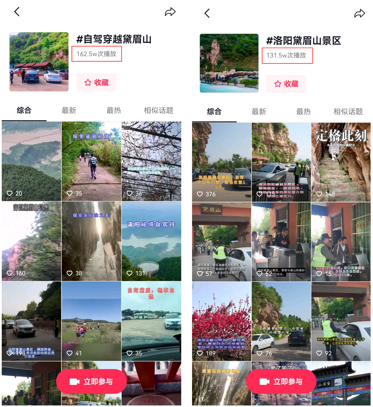 其次,视频和话题曝光量带来的声量效应。688 条视频,带来66.3万+的视频曝光量,让黛眉山景区的知名度迅速扩大。无论是在本地还是在全国范围内,越来越多的人开始了解和关注这个美丽的景区。同时,还搭建的 #自驾穿越黛眉山 和#洛阳黛眉山景区 又分别带来高达 162.5万和131.5万的话题曝光。这些话题如同导火索一般,引发了用户的热烈讨论和分享,进一步扩大了景区的影响力。