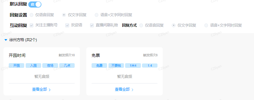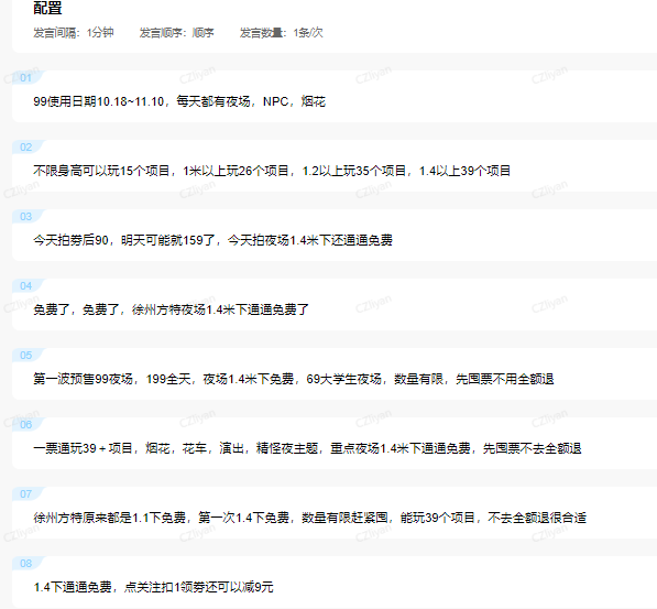而除了对用户提问的“互动回复”设置外,还使用了抖捧的“文字场控”功能,在用的直播配置是上传的8条文字场控内容,选择了按顺序发言的配置,并设置每隔1分钟进行1条的发言,提高用户互动体验的同时,又不会让发言条数太密集,影响用户直播间的体验。