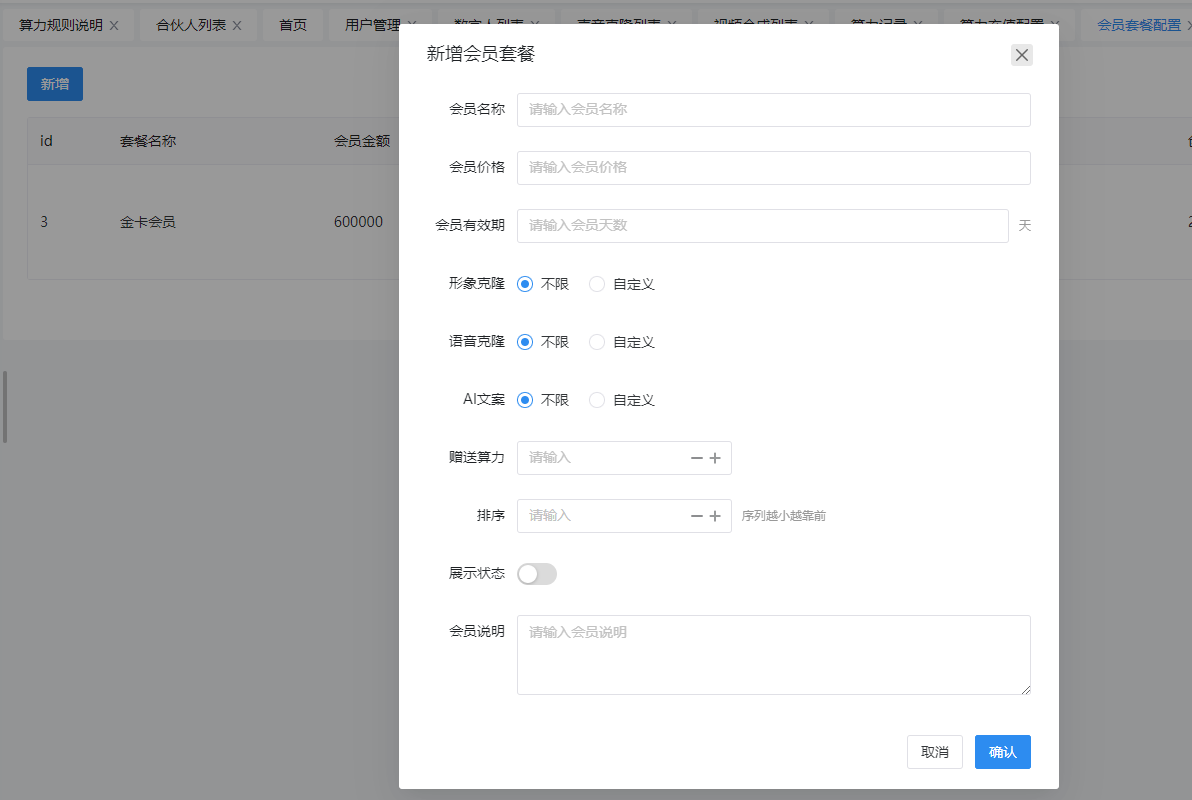 会员盈利模式设置为了更加迎合OEM的业务场景,小魔推数字人对会员模式进行了升级,OEM客户可以在后台进行会员权益自定义设置,比如对会员进行级别划分,季卡、月卡、年卡,或者金牌、银牌、铜牌,针对这个不同的会员等级去设置对应的会员价格和权益。(权益即克隆形象的使用,克隆声音的使用和智能文案的使用次数)