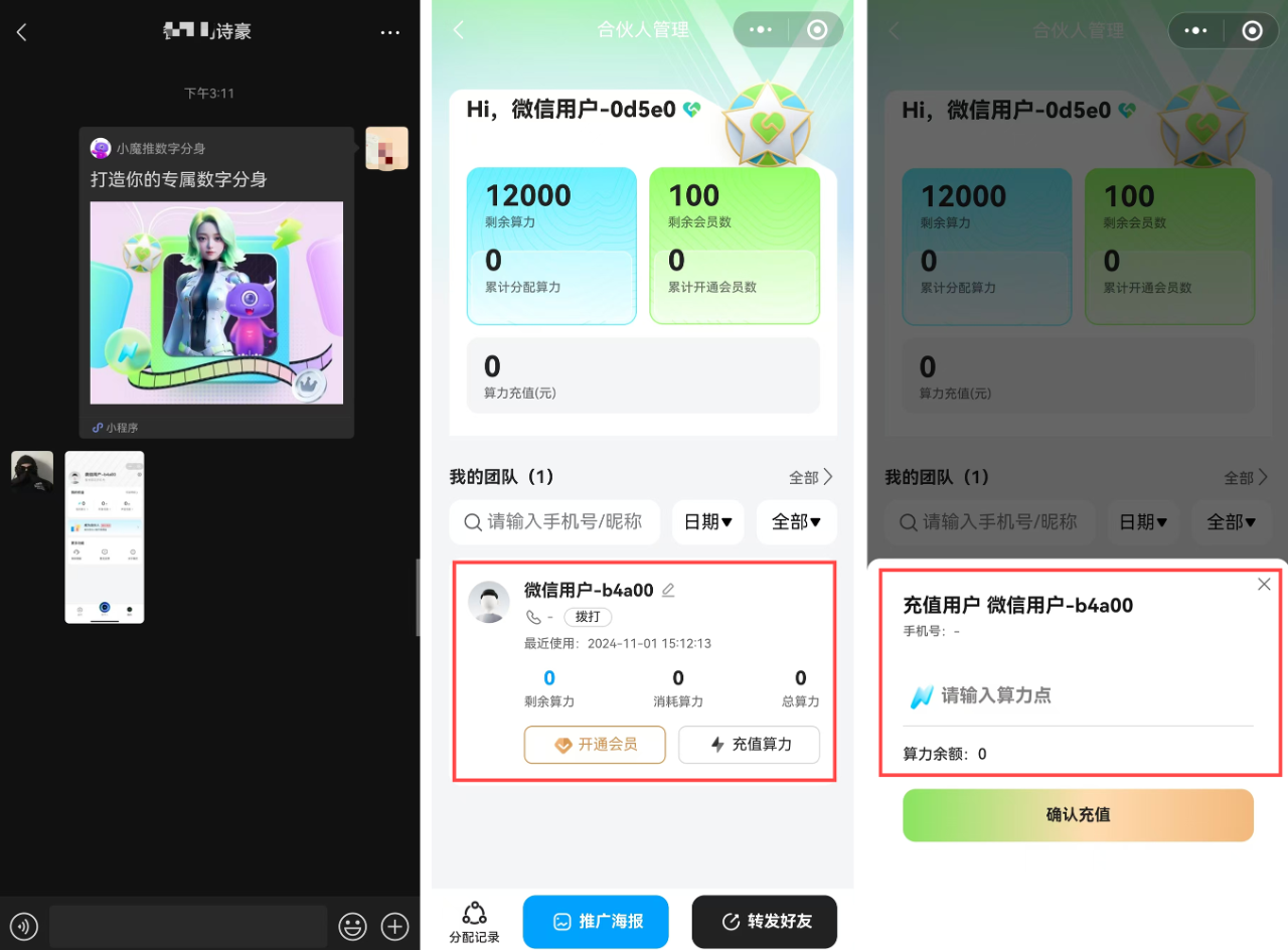 也可以直接通过微信小程序里面的转发功能,直接转发给某一个好友。然后好友通过这个小程序卡片点进来进行小程序注册,完成之后就会成为用户,然后“合伙人”就可以给用户去充值算力。