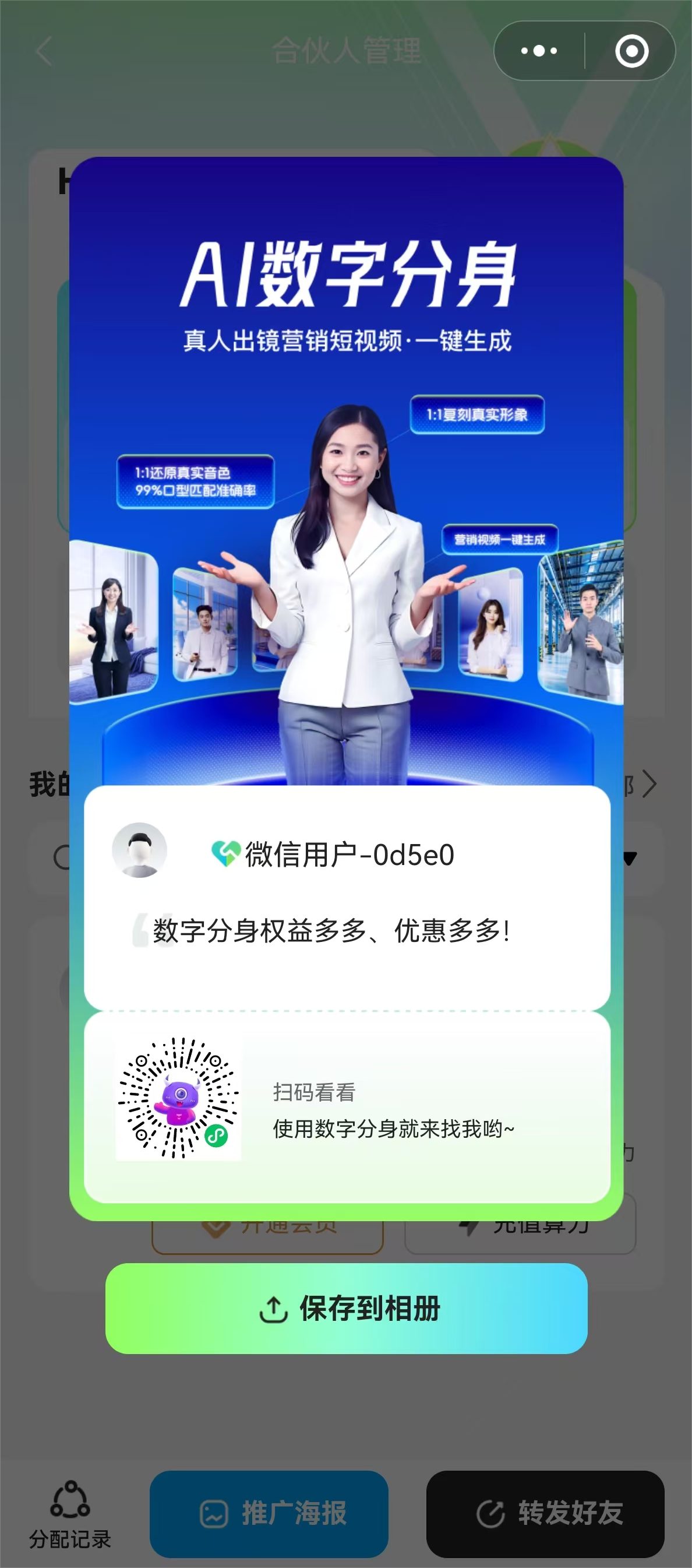 这里我们可以直接生成一个推广海报,“合伙人”可以让他的用户去扫描海报上的二维码,然后再绑定用户自己的手机号即可。