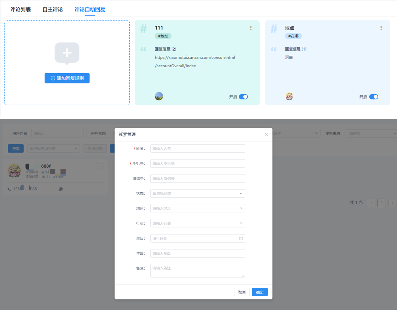 三 精准引流拓客,锁定目标客户群小魔推利用大数据和AI技术,精准定位目标客户群体,将视频推送给真正对产品或服务感兴趣的潜在客户。同时,小魔推的智能管理功能,比如私信回复管理、评论管理、线索管理等,可以及时的做到对用户的反馈,跟进线索锁定目标客户,避免线索的流逝。