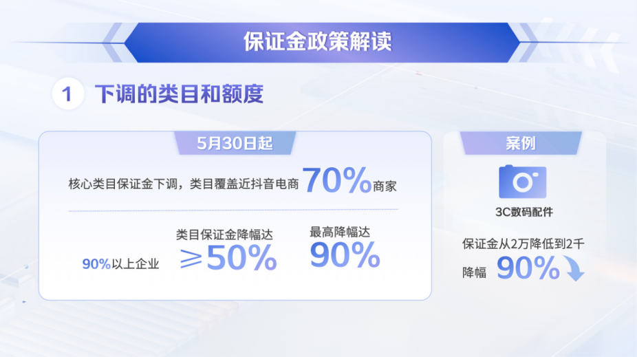 最后再来说抖音:抖音生活服务在今年的双十一大促中,更是对平台综合类目商家的保证金进行了大幅下调。以3C数码配件类目为例,保证金从原先的2万元大幅降至2000元,这一举措极大地减轻了商家的前期投入压力,降低了入驻门槛。