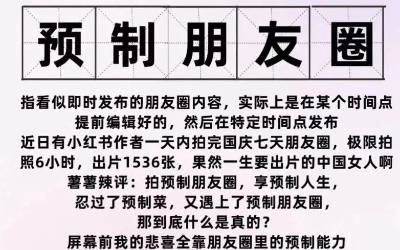 “预制”这个概念我们听得最多的应该是来源于“预制菜”,如今“预制”概念又火出了圈。“预制晨袍照”,新娘会提前拍摄晨袍照,这样结婚当天就不用起早了;预制婚纱照,新人会选择提前很长时间拍摄婚纱照,以便有足够的时间挑选照片、进行后期制作等;预制朋友圈,提前拍摄好照片,编辑好朋友圈文案,在需要的时候就可以直接发布了。