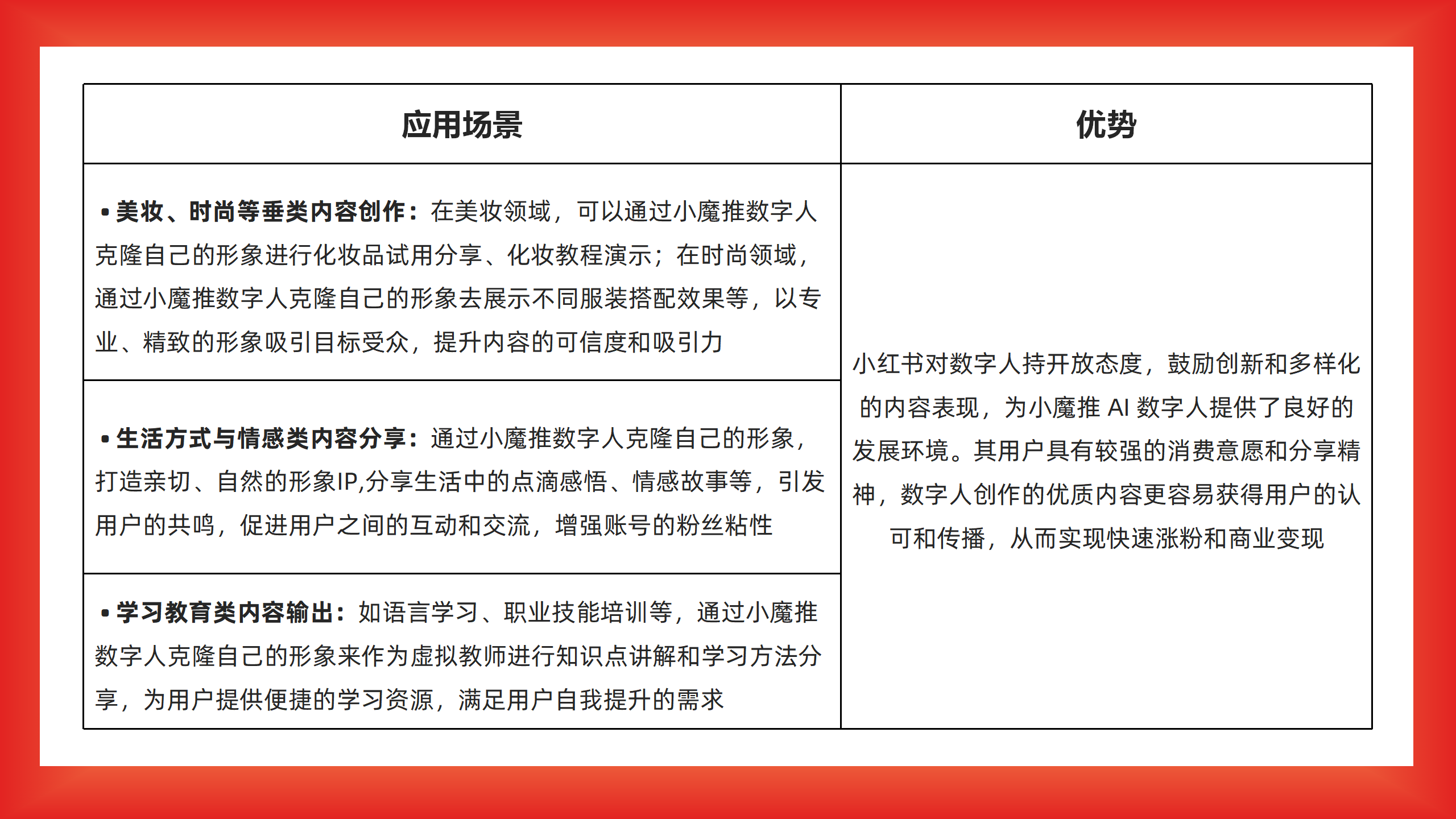 PART/2 四大平台,多元化应用场景与优势小魔推 AI 数字人在当今的社交媒体领域展现出了强大的实力和潜力。它在抖音、快手、小红书和视频号这四大热门平台上,拥有着丰富多样的应用场景和令人瞩目的优势。能够为创作者在不同平台上提供个性化的内容创作支持。无论是在抖音的短视频领域、快手的娱乐场景打造、小红书的生活分享平台,还是视频号的多元化内容生态中,它都能根据平台特点和用户需求,快速生成高质量的内容。