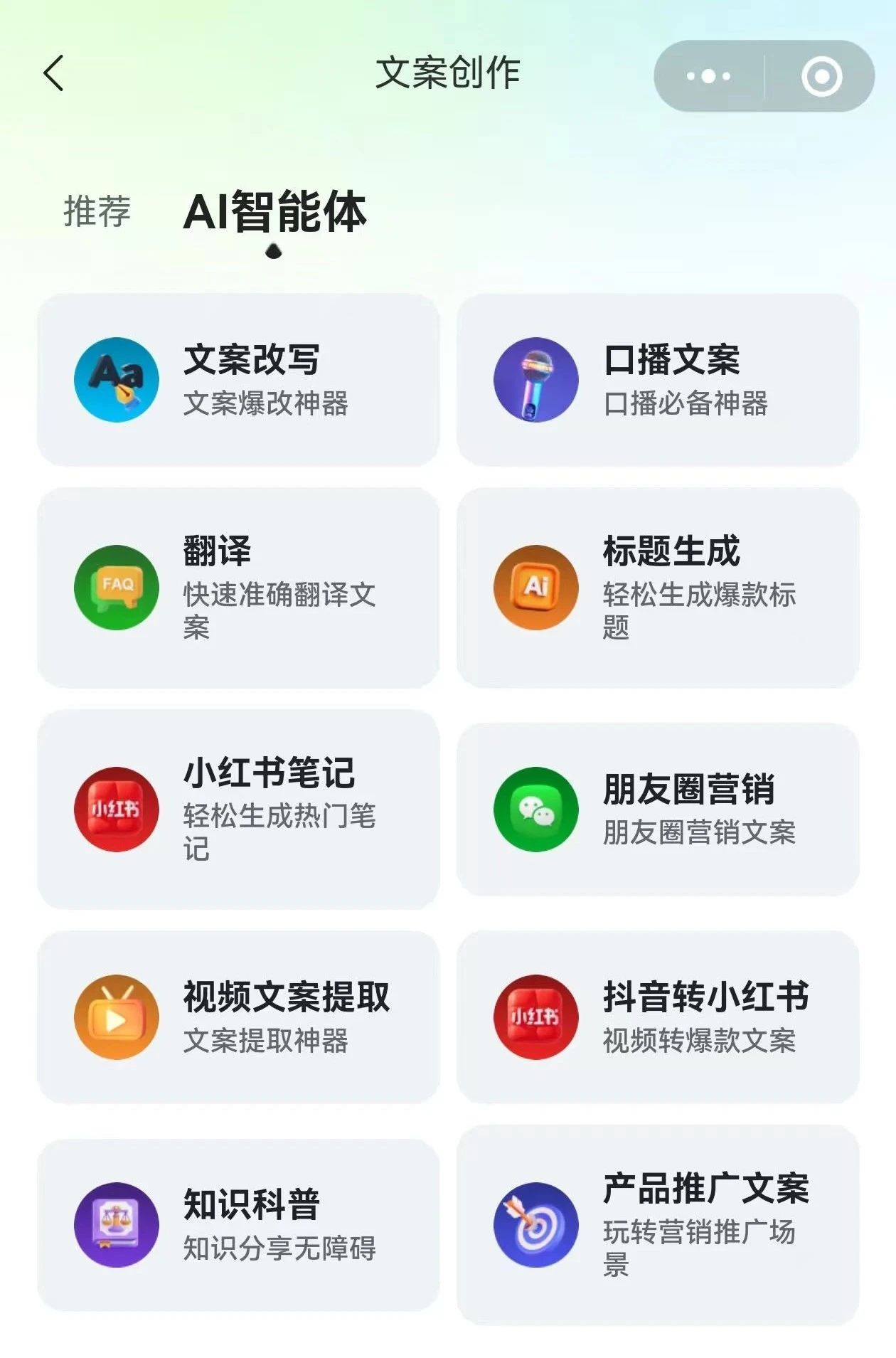 「AI 智能体」将AI文案创作能力进行了细分,除了之前具备的“文案改写”、“口播文案”和“标题文案”生成外,又新增了中英文语言的快速“翻译”、更符合小红书、朋友圈平台风格的AI文案生成、以及抖音/快手平台的短视频文案提取、将抖音/快手上的短视频直接转成小红书的文案、知识科普类的文案生成、产品推广类的文案生成。借助AI,更全面的提升视频的文案创作能力!