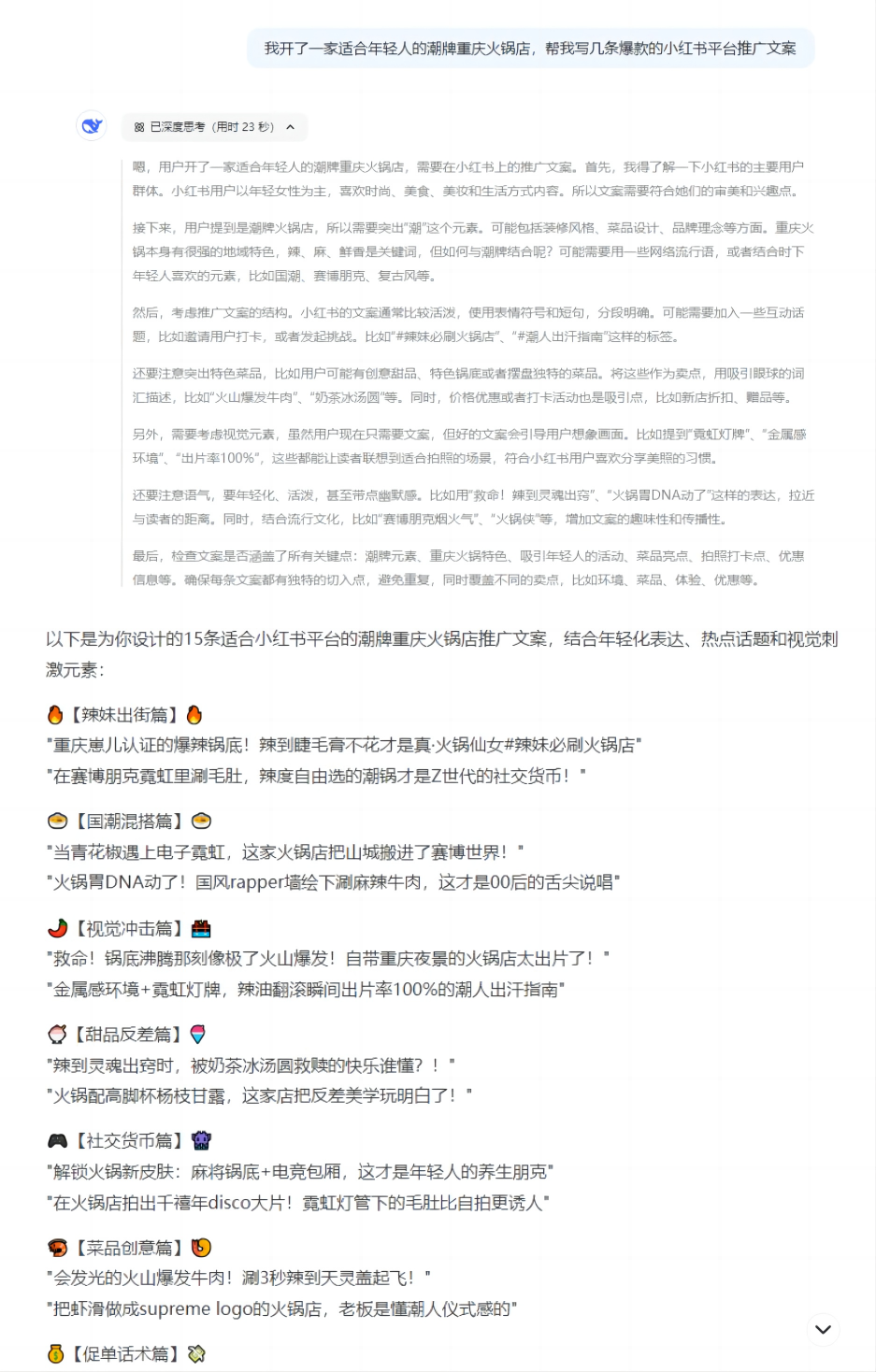 • DeepSeek文案生成辅助:DeepSeek作为智能营销平台因其强大的数据洞察力和智能算法,不仅能根据商家需求智能生成个性化内容,还能通过大数据分析深度洞察用户偏好,从而在创意、投放、引流等方面提供强大的支持。