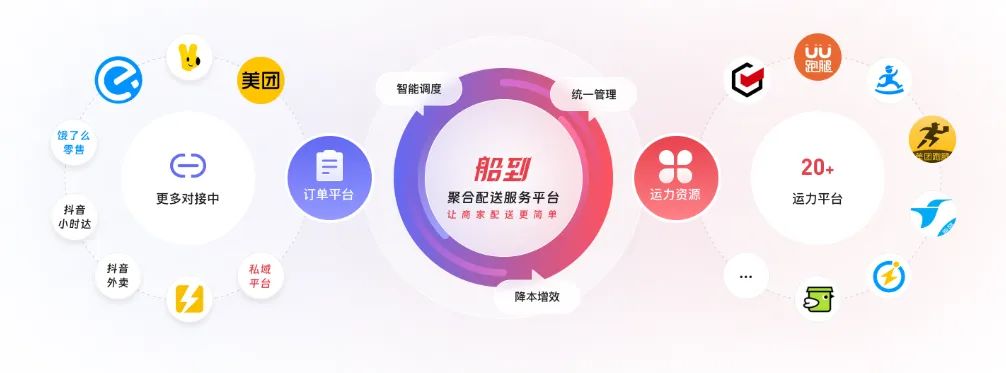 • 智能匹配配送资源:船到与UU跑腿、蜂鸟、闪送、达达、顺丰等多个平台合作,能够根据订单量、配送需求和服务时效等因素,智能匹配合适的配送资源。