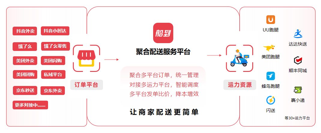 商家在面对美团、饿了么、抖音,如今又加上京东外卖的多平台格局下,一定会面临订单接单与配送、订单管理、店铺管理、数据分析等各种外卖订单问题,船到一个平台就能解决商家外卖订单的各种需求。另外,京东外卖支持两种配送模式,一是使用平台的运力进行配送,二是选择商家自送。船到针对“商家自送”模式也独具优势,比如降低配送成本、自动选择最优配送平台、多平台自动抢单、订单跟踪等。