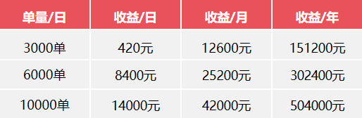 2)订单服务收益(长期管道收益):假定合伙人每单收取服务费0.2元,每单获得70%的返佣,则: