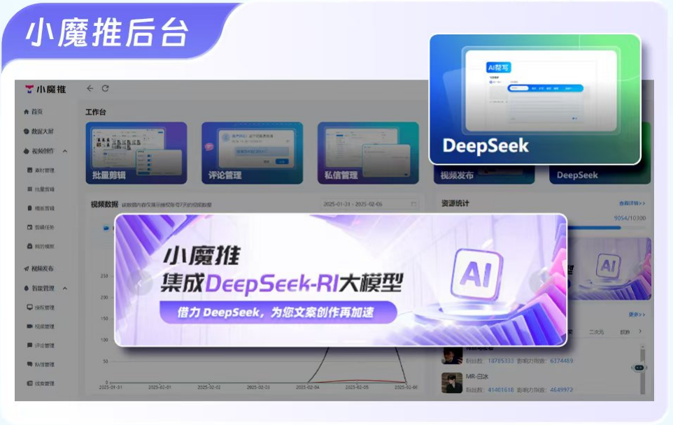 小魔推后台集成了deepseek工具,输入关键词就能智能生成文案。DeepSeek为商家短视频文案创作提供高效智能解决方案,其多模态理解能力可精准分析视频内容与用户偏好,生成创意吸睛文案,同时智能嵌入平台关键词与标签以提升算法推荐流量;此外,还能结合实时用户互动数据反馈,持续优化文案策略,助力商家提升转化率与品牌传播效果。商家借助deepseek生成了大量优质文案,能精准抓住用户痛点。