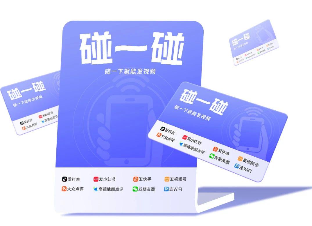 操作简单,一“碰”即发: 顾客无需扫码、无需下载APP,只需用手机轻轻一碰,即可将预设好的精美短视频发布到抖音、快手、视频号、小红书等多个平台,让你的店铺瞬间刷爆朋友圈!